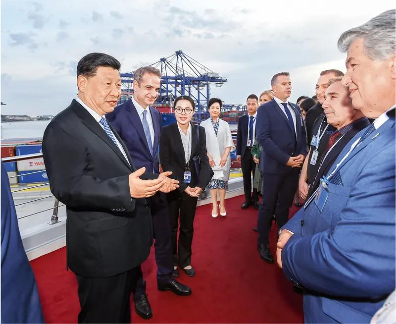 当地时间2019年11月11日,国家主席习近平和夫人彭丽媛在希腊总理米佐塔基斯夫妇陪同下,共同参观中远海运比雷埃夫斯港项目。这是习近平与当地员工代表亲切交谈,询问他们的工作和生活情况。 新华社记者 谢环驰/摄